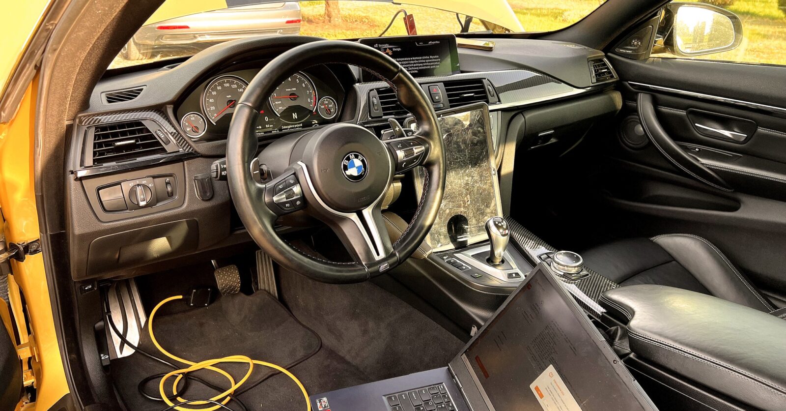 Wykonaliśmy szereg modyfikacji: zaczęliśmy od aktualizacji oprogramowania (soft + nawigacja), przeprowadziliśmy kodowanie funkcjonalne i aktywowaliśmy funkcje smart – Apple CarPlay oraz Android Auto. Następnie zrealizowaliśmy „chiptuning”, wgrywając oprogramowanie sterujące z wersji i3s, która ma 184 KM 😎. Dodaliśmy tryb SPORT, zmieniliśmy również dźwięki ostrzegawcze i zewnętrzne, aby spersonalizować samochód bardziej pod siebie.
