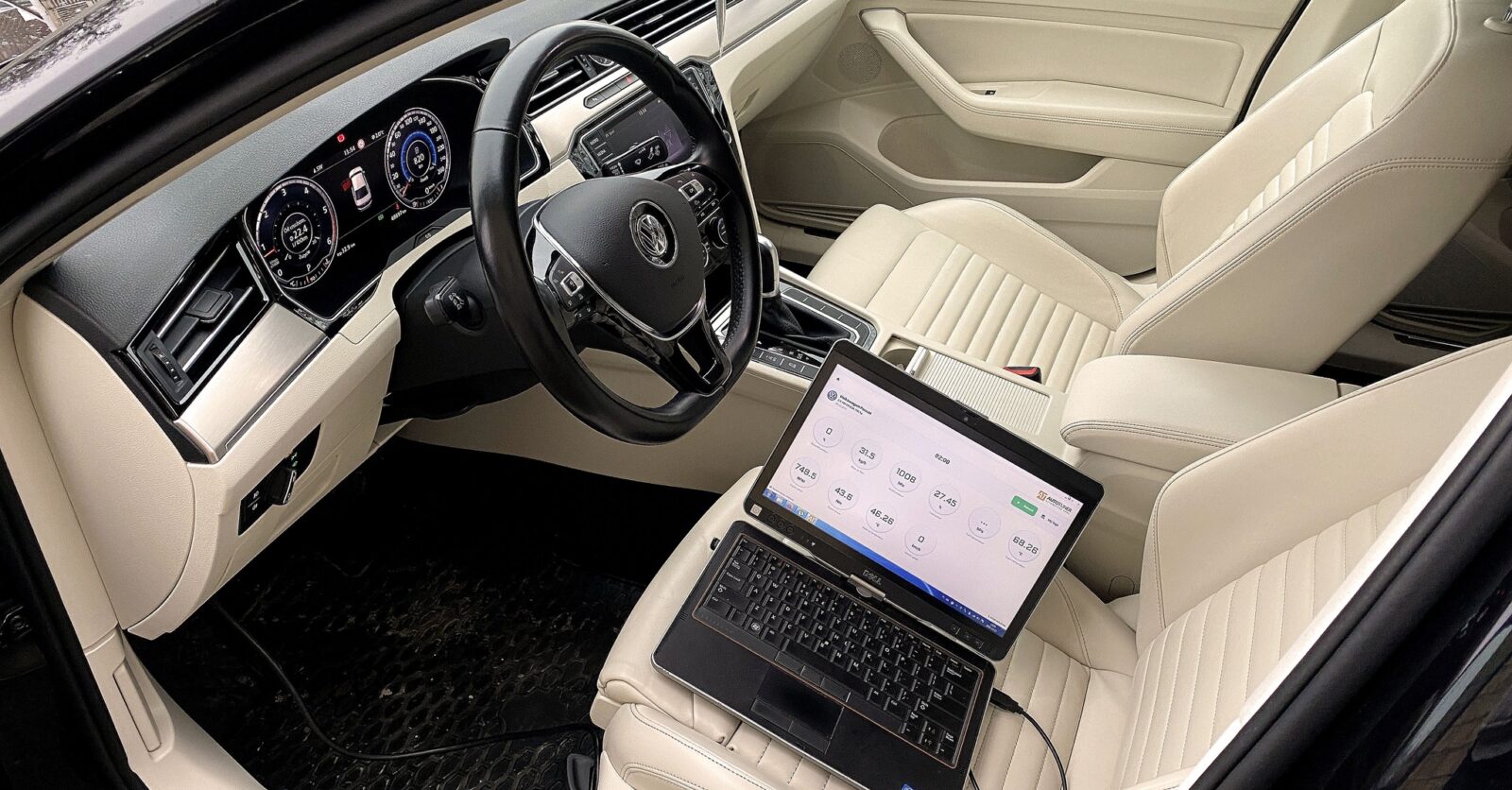 Rozpoczęliśmy od pełnej diagnostyki wszystkich modułów w pojeździe, aby mieć pewność, że każda zmiana będzie bezpieczna i skuteczna. Następnie przystąpiliśmy do działania – wykonaliśmy chiptuning silnika i skrzyni biegów (Stage 1), co znacząco poprawiło dynamikę oraz elastyczność jednostki napędowej. Zaktualizowaliśmy oprogramowanie sterownika skrzyni DSG, wyłączyliśmy uciążliwy system AdBlue, a także dezaktywowaliśmy Start&Stop, który szczególnie w warunkach miejskich bywa irytujący i zbędny.